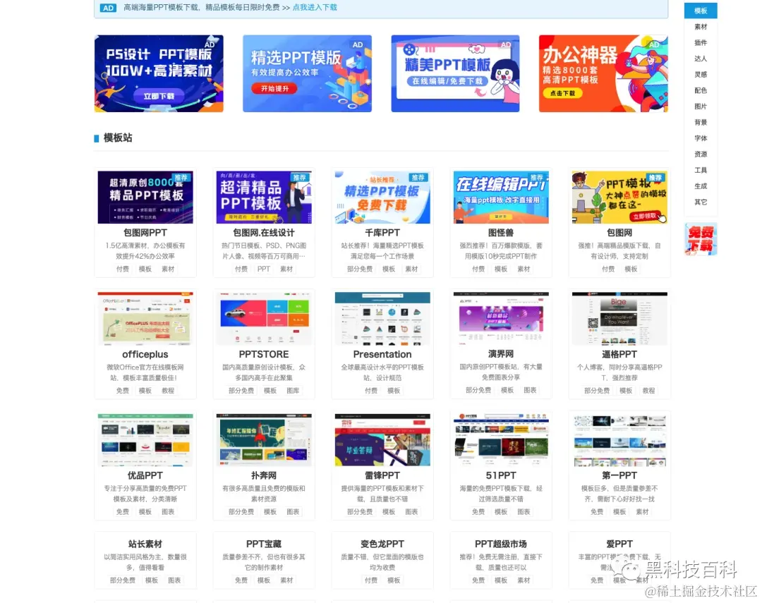 一款非常全面的ppt资源导航网站,汇集了模板站、素材包 、大神作品集、PPT插件、PPT达人微博、 配色工具、免版权图库、免扣素材、 背景、纹理、字体等各种相关内容网址。