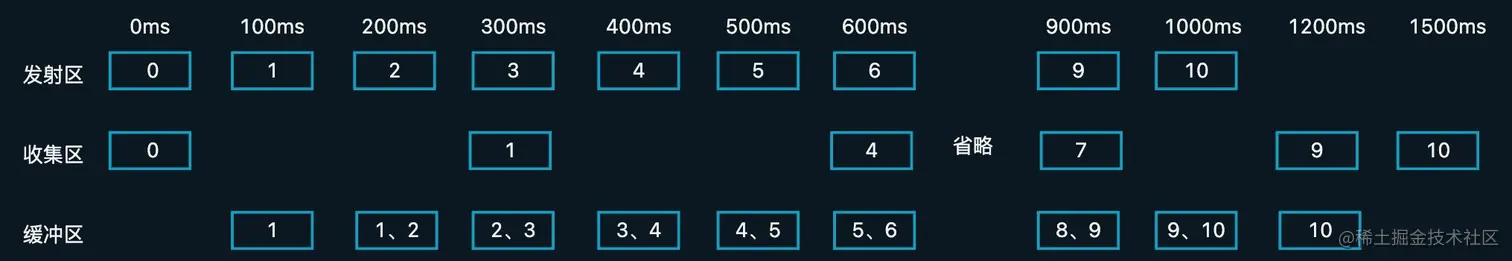 - 后面的1200ms和1500ms,收集处开始缓冲区依次获取数据6和9,最终在1500ms接收结束,整个流程也就完成了。
