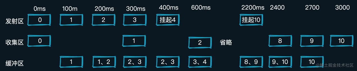 - 0ms时,SharedFlow开始发送数据0,接收处也开始接收数据0,此时缓冲区没有数据新增,接收处开始执行延时操作;