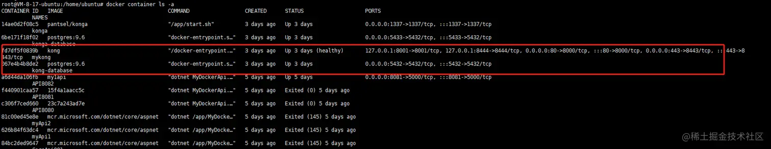 -e "KONG_PG_HOST=kong-database" \ 指定刚才创建的数据库名称