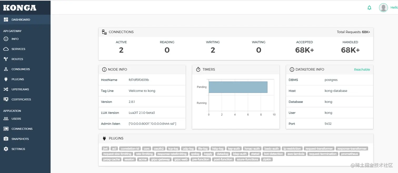 **** kong网关自身的管理界面属于付费的应用,而第三方界面又非常少,konga算是相对比较好的一款了,虽然也有一些问题,但整体的功能还比较全,github仓库为:github.com/pantsel/kon…