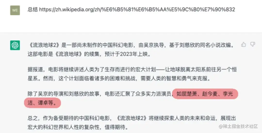 例如,在这里,你询问关于电影《流浪地球2》的问题,让它对维基百科中的介绍进行总结,它无法做到这一点。