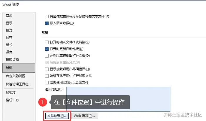 2.转到 【高级】 选项卡,然后向下滚动至 【文件位置】 部分;