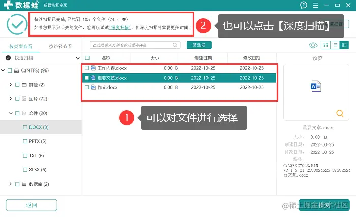 3.第一次扫描完成后,软件会呈现一些比较浅层的文件,可以对其进行选择,也可以点击深度扫描后再全部一起选择;