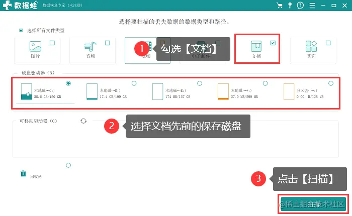 2.在主界面中,可以勾选上 【文档】 ,并选择这个文档先前的保存路径,点击 【扫描】 ;