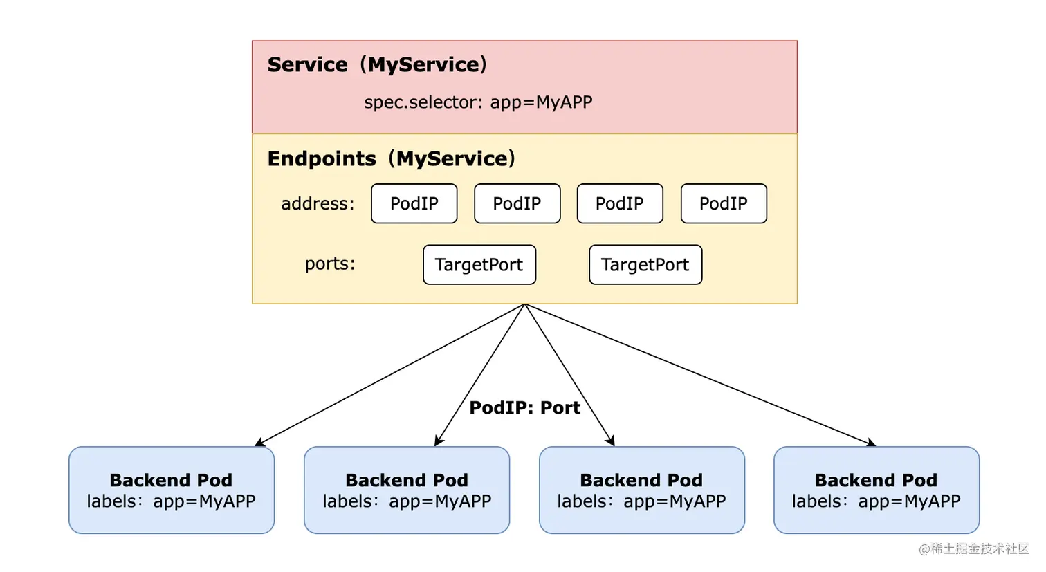 我们先看看Service、Endpoints与Pod 的关系。如图下图所示,Endpoints表示一个Service对应的所有Pod副本的访问地址,Endpoints Controller就是负责生成和维护所有Endpoints对象的控制器。