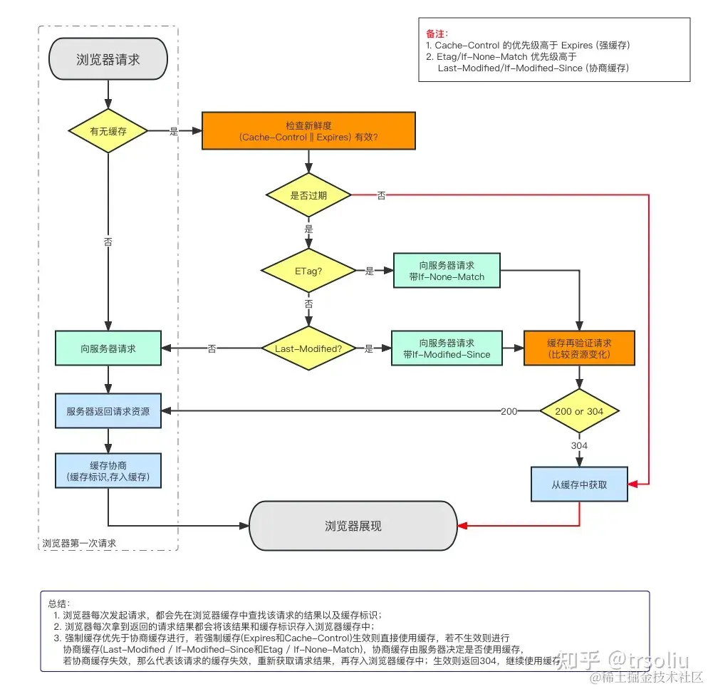 在优先级上,Etag优于Last-Modified,Etag和Last-Modified可同时存在。本地缓存时间到期后,浏览器向服务端发送请求报文,其中Request Header中包含If-none-match和Last-Modified-Since(与服务端Etag和Last-Modified对比,Etag优先级高),用以验证本地缓存数据验证是否与服务端保持一致。在服务器端会优先判断Etag。如果相同,返回304;如果不同,就继续比较Last-Modified,然后决定是否返回新的资源。若服务端验证本地缓存与服务端一致,返回304,浏览器加载本地缓存;否则,服务器返回请求的资源,同时给出新的Etag以及Last-Modified时间;