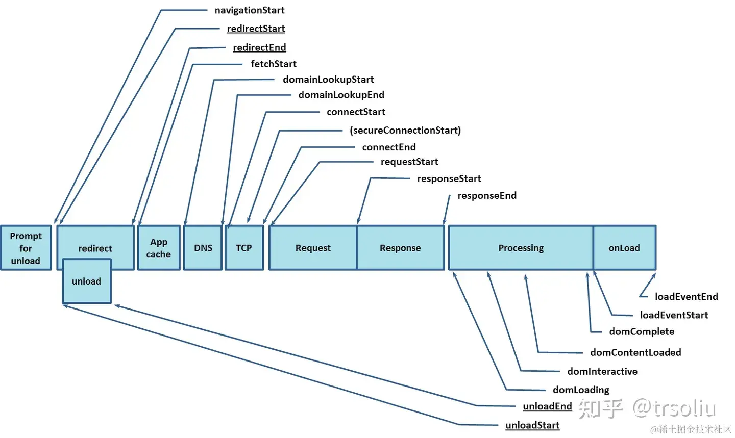 在开始介绍网络传输性能优化之前,我们需要先了解浏览器与服务器处理用户请求的过程,以下是navigation timing监测指标图:www.w3.org/TR/navigati…