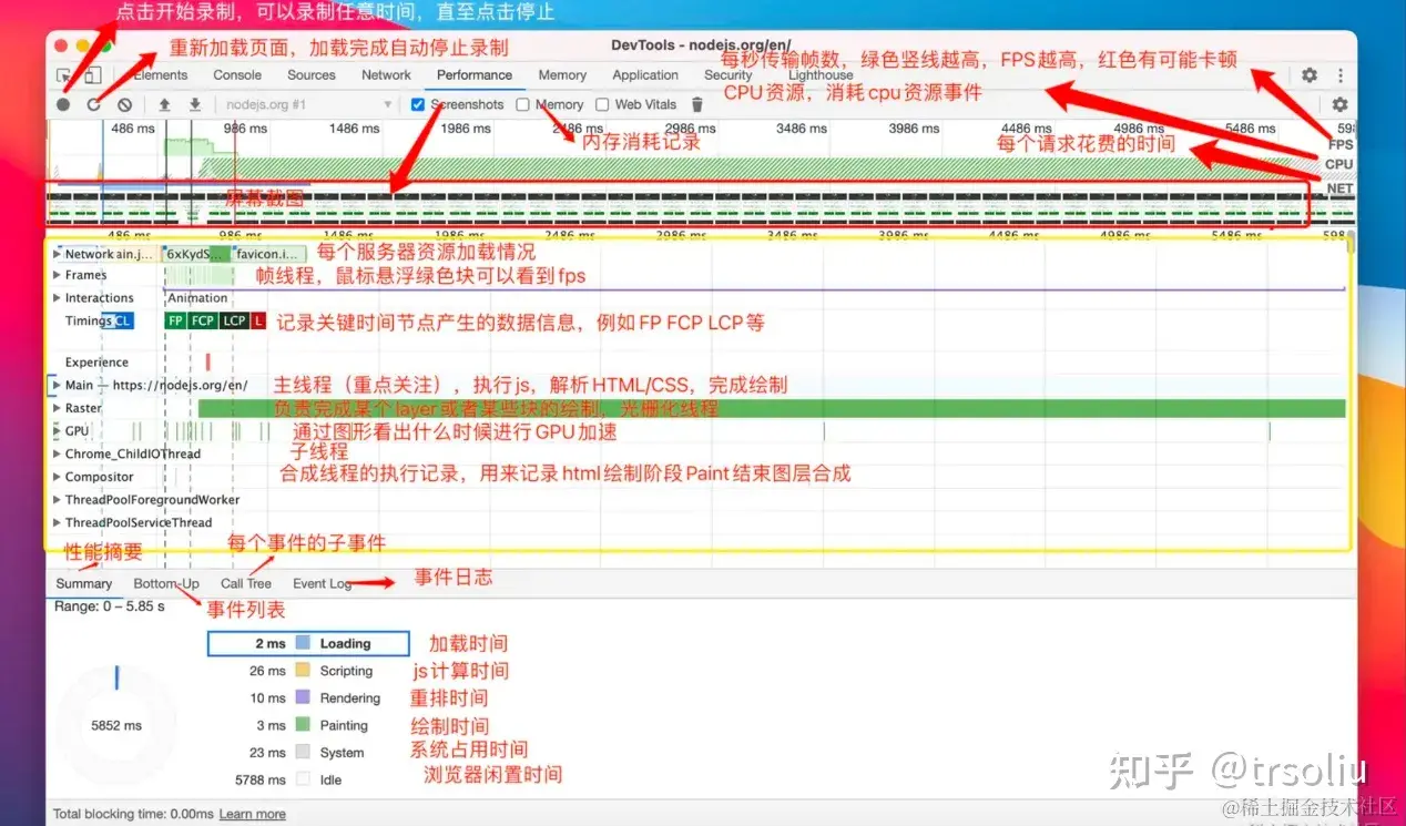 处理各个任务花费的时间,选择一段CPU统计可以在区域四的Summary看到统计表格 Scripting 脚本 Rendering 渲染 Painting 绘制 Loading 加载 ldle 闲置