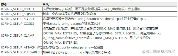 flags、sq_thread_cpu和sq_ thread_idle字段用于配置io_uring实例。flags是一个位掩码,其中0个或多个以下值一起或: