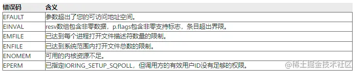 成功时返回新的文件描述符。然后,应用程序可以在随后的mmap系统调用中提供文件描述符,以映射提交队列(submission queues)和完成队列(completion queues),或者传给io_uring_register() / io_uring_enter()系统调用。