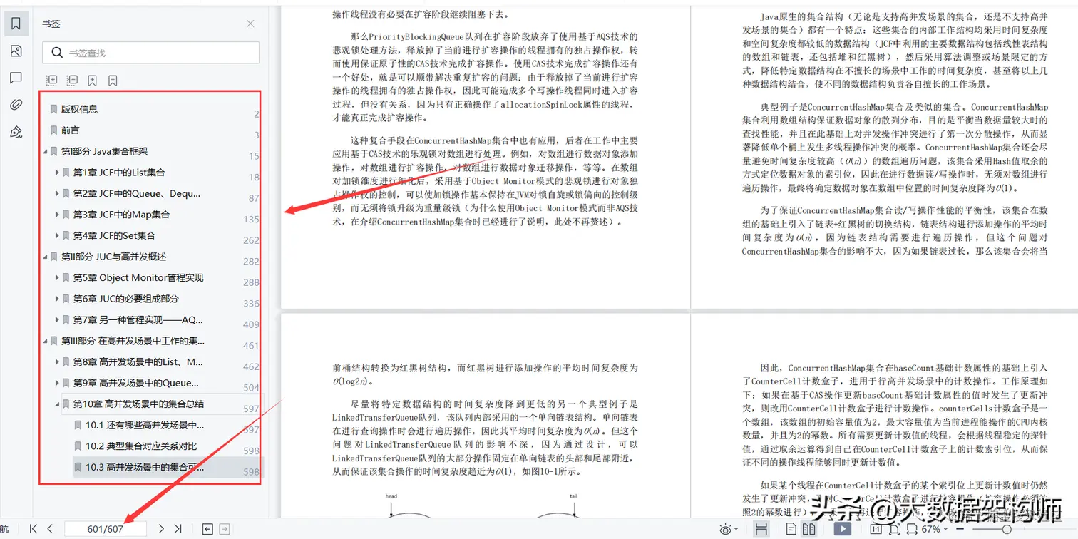 这份笔记总共有607页,根据本文的知识逻辑,读者会从JCF部分的知识脉络过渡到JUC部分的知识脉络,最后回到JCF本身。