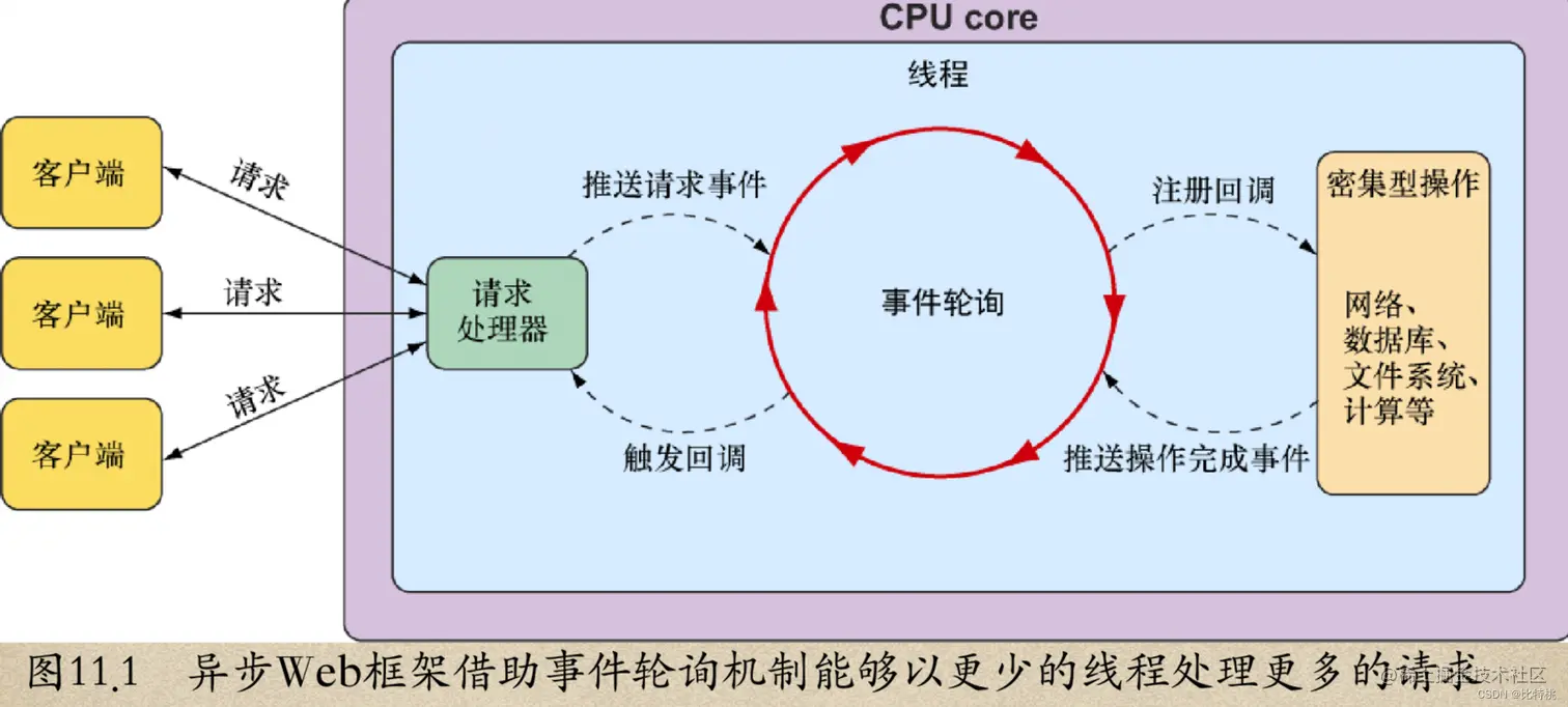 异步的Web框架能够以更少的线程获得更高的可扩展性,通常它们只需要与CPU核心数量相同的线程。通过使用所谓的事件轮询(event looping)机制(如图11.1所示),这些框架能够用一个线程处理很多请求,这样每次连接的成本会更低。