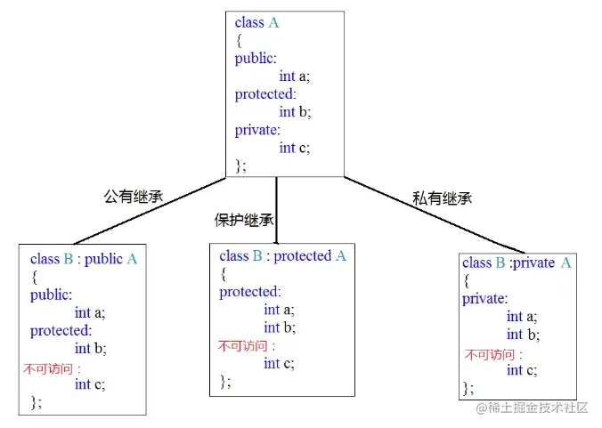 继承方式包括 public(公有的)、private(私有的)和 protected(受保护的),此项是可选的,如果不写,那么默认为 private。