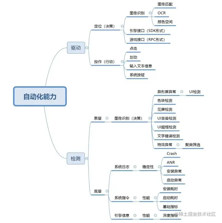 自动化能力可以分解为驱动和检测两部分,每一部分可以对应多项子能力,把驱动和检测中各项子能力组合便形成自动化应用场景。这种思路化整为零有利于自动化工作的快速落地。