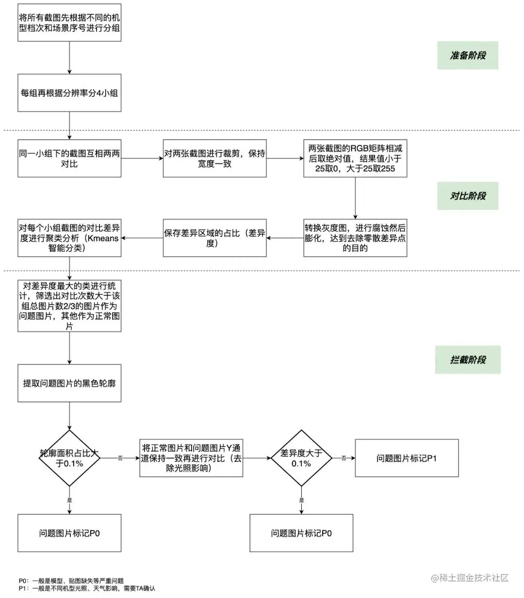 基于游戏接口驱动游戏截图保存。将相同档次相近分辨率的设备进行分组,同一小组内相同场景序号的截图两两对比,基于“兼容性问题一般出现在非多数机型”认知下进行全自动聚类分析,从而拦截问题截图。