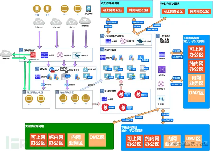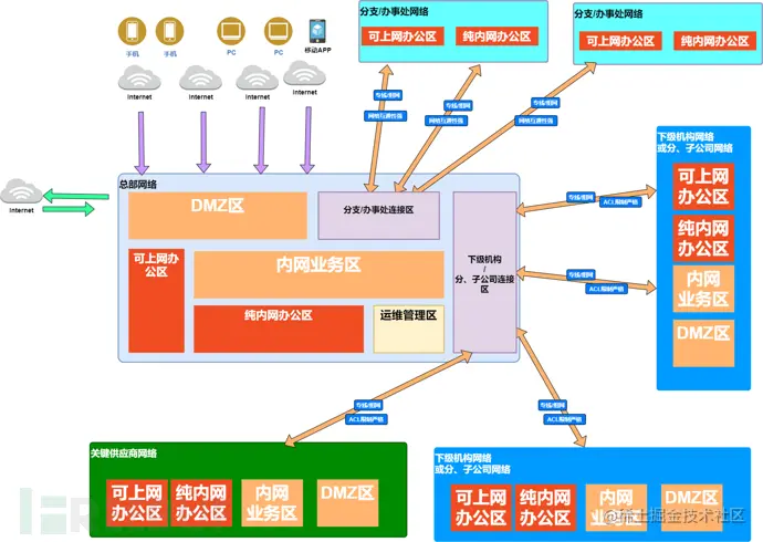5、 分支/办事处连接区 :分支/办事处,是 指其全权控制和管理的直属部门单元 。多数情况下是通过专线/组网方式,和总部的办公网打通。
