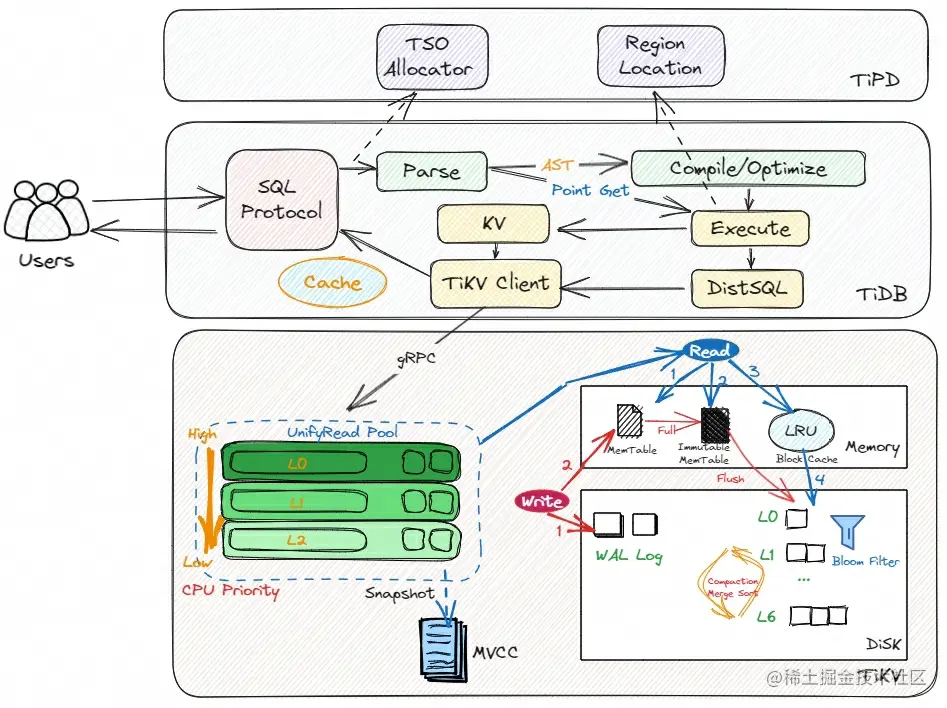 ● TiKV Client 模块负责和存储层进行交互,查询请求经过 gRPC 调用,会优先进入 Unified Read Pool 线程池。
