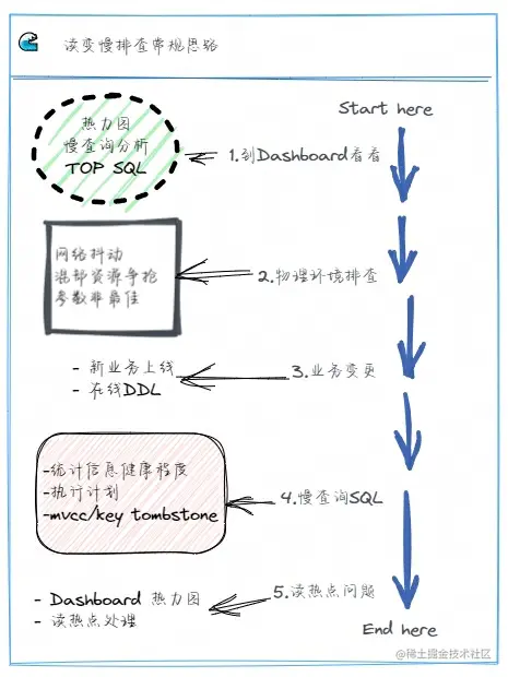 接着,和写入变慢的分析一样,我们可以依次排查物理硬件环境、是否有业务变更操作等情况,直到定位清楚问题。如下图所示,业务读 SQL 变慢的分析思路可以有下面步骤: