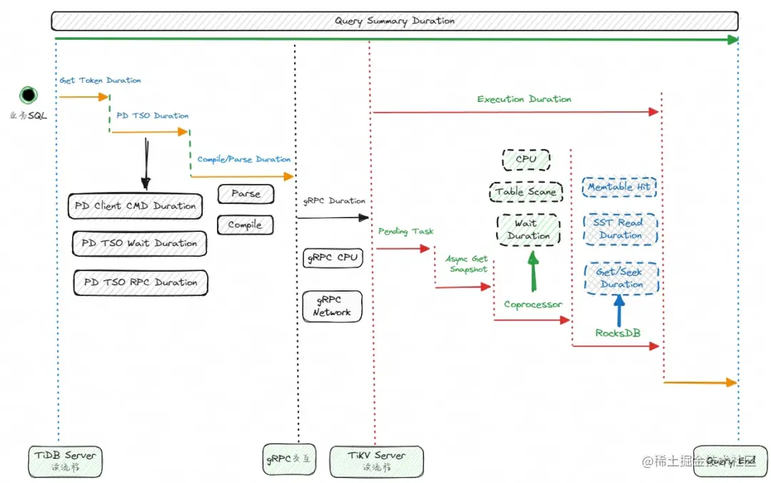 上面描述的过程,大致就是一个查询请求在 TiDB 集群内部的流转步骤,这也是我们在遇到读慢时的分析步骤。