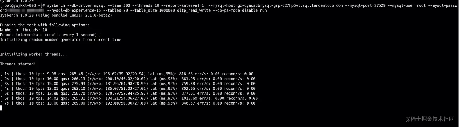 sysbench --db-driver=mysql --time=300 --threads=10 --report-interval=1 --mysql-host=gz-cynosdbmysql-grp-d27hp6vl.sql.tencentcdb.com --mysql-port=27529 --mysql-user=root --mysql-password=password --mysql-db=experience-15 --tables=20 --table_size=1000000 oltp_read_write --db-ps-mode=disable run