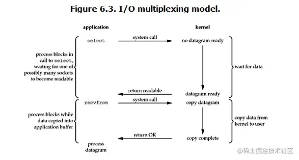 这个图和 blocking IO 的图其实并没有太大的不同,事实上,还更差一些。因为这里需要使用两个 system call(select 和 Socket 调用(recvfrom)),而 blocking IO 只调用了一个 system call(Socket 调用)。