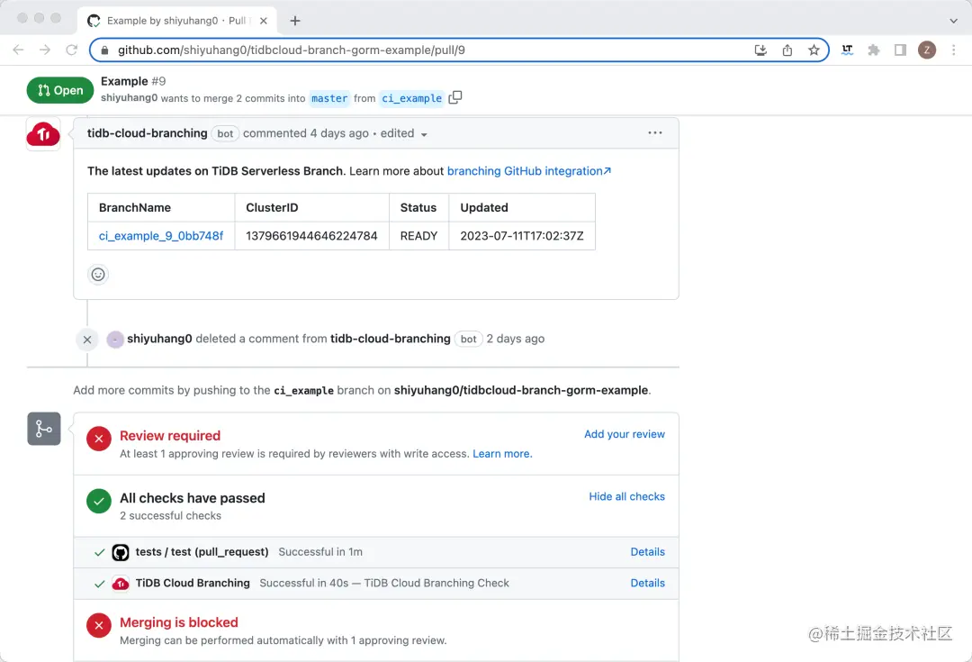 在完成设置后,每当创建 pull request 时,TiDB Cloud 分支管理 GitHub App 将为拉取请求生成一个 TiDB Serverless 分支。然后,CI 流程将等待分支就绪并将其用于测试。这确保您使用这些分支执行的任何测试都可以映射到生产数据库中的数据,从而更容易及时发现任何潜在问题。