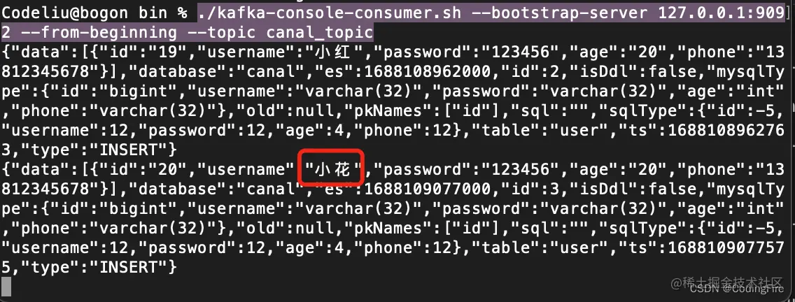 ./kafka-console-consumer.sh --bootstrap-server 127.0.0.1:9092 --from-beginning --topic canal_topic