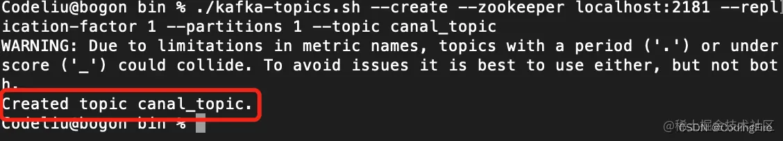 ./kafka-topics.sh --create --zookeeper localhost:2181 --replication-factor 1 --partitions 1 --topic canal_topic