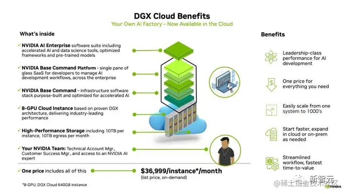 其中,DGX Cloud提供了预训练模型、数据处理框架、向量数据库和个性化、优化推理引擎、API以及英伟达专家的支持,帮助企业定制用例并调整模型。