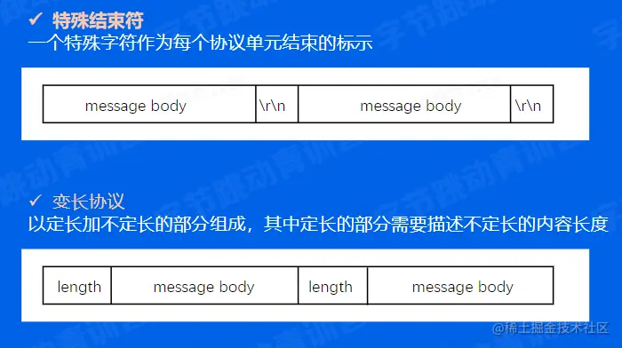 变长协议:一般都是自定义协议,有 header 和 payload 组成,会以定长加不定长的部分组成,其中定长的部分需要描述不定长的内容长度,使用比较广泛