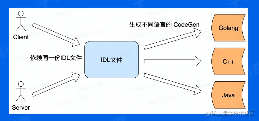 服务双方是通过约定的规范进行远程调用,双方都依赖同一份IDL文件,需要通过工具来生成对应的生成文件,具体调用的时候用户代码需要依赖生成代码,所以可以把用户代码和生成代码看做一个整体。