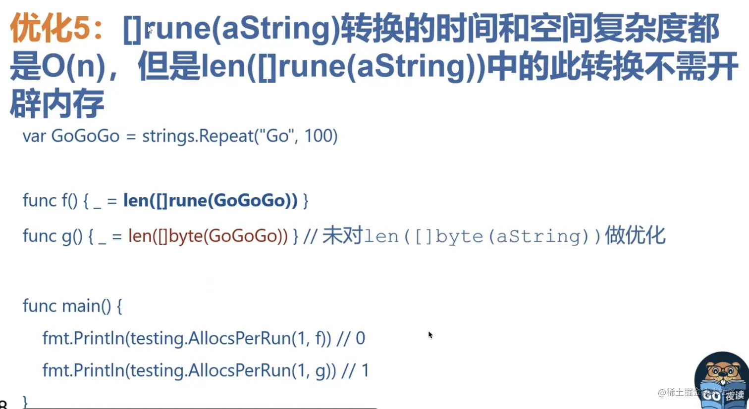 5.[]rune(aString)转换的时间和空间复杂度都是O(n),但len([]rune(aString))中的此转换 不需要开辟内存