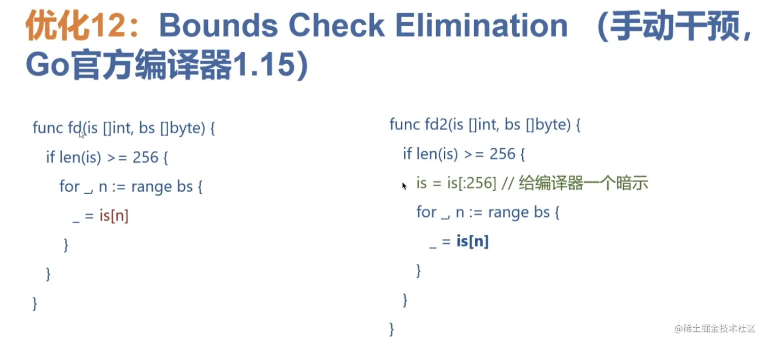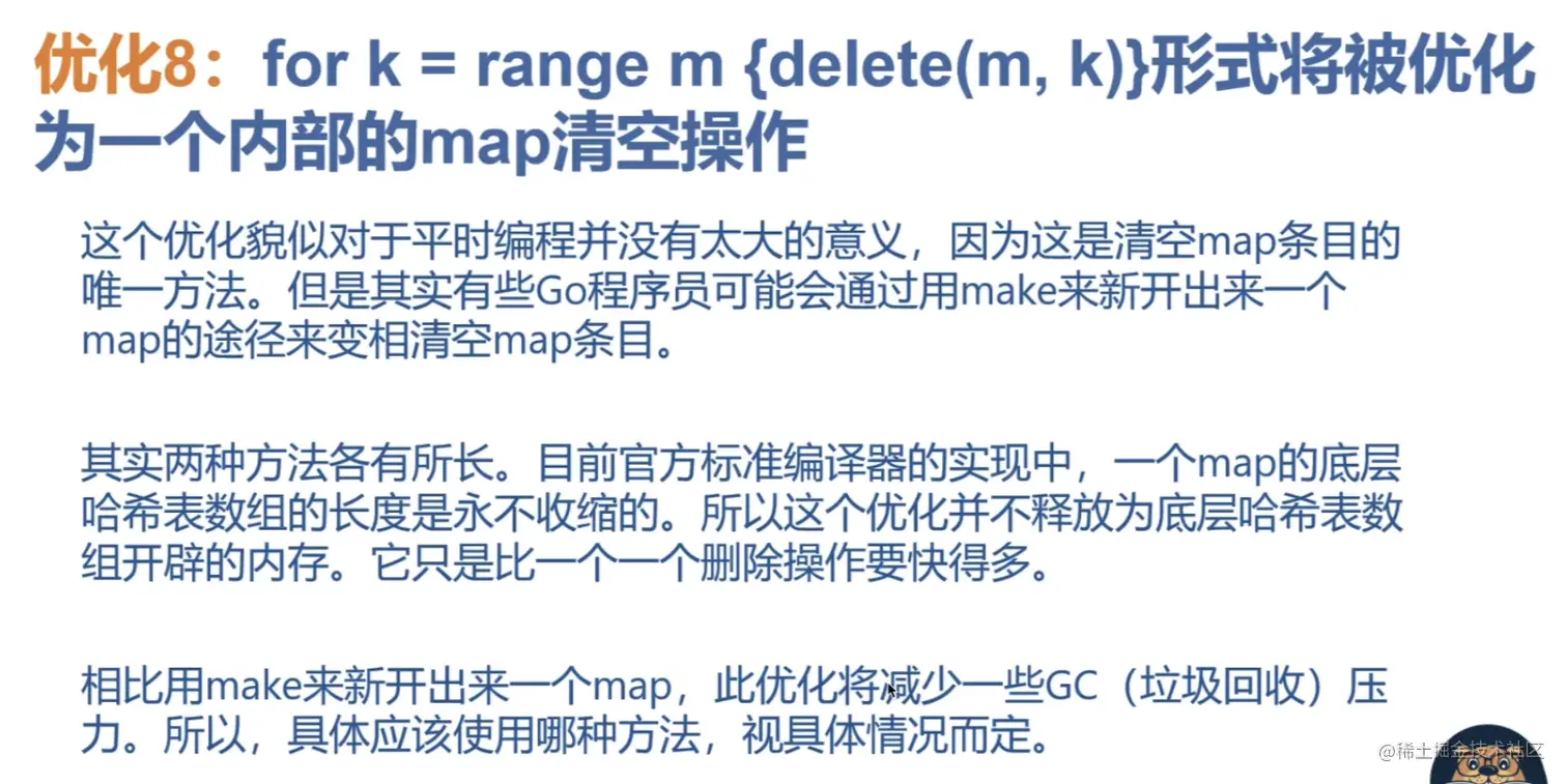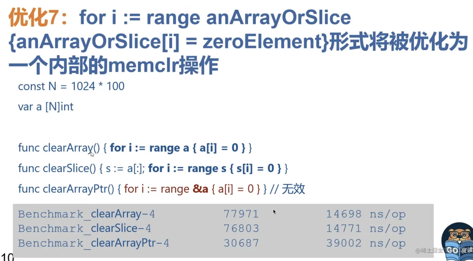 7.for i := range anArrayOrSlice{anArrayOrSlice[i]} = zeroElement} 形式 将被优化为一个内部的memclr操作