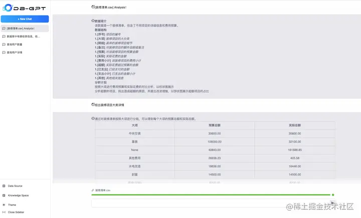 首先我们根据前面的原理介绍,上传Excel文档。文档上传成功之后,DB-GPT会根据文档内容,对文档进行总结说明,并推荐一些常见的分析手段。 如下图所示。