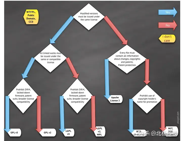 乌克兰程序员 Paul Bagwell 画了一张分析图,说明应该怎么选择。只用两分钟,你就能搞清楚这六种开源协议之间的最大区别。