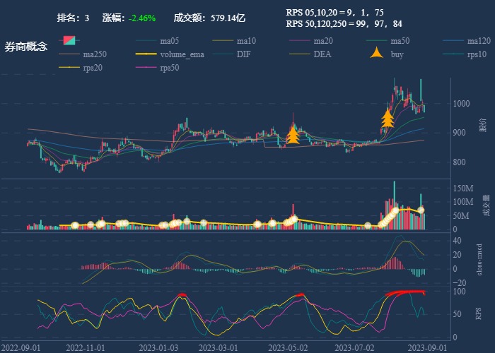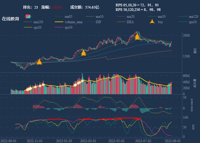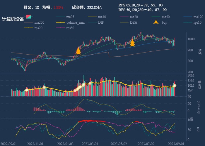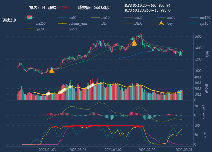 - 一线红:第一次买点出现后往往是顶峰,等回调,macd 反转,rps50 还一直红,第二次买点重现