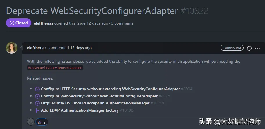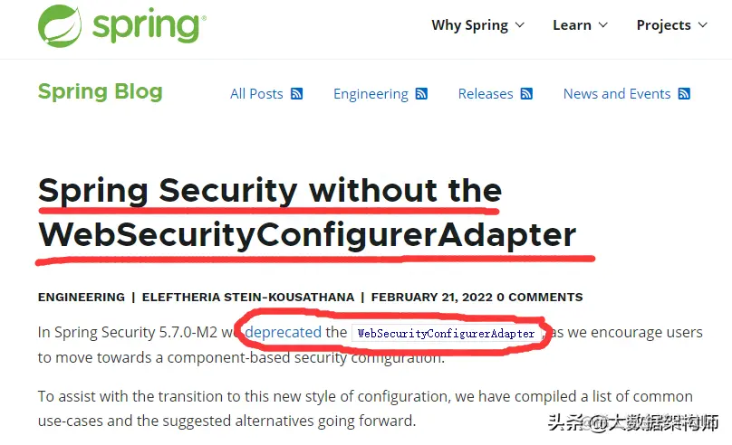 WebSecurityConfigurerAdapter的都知道对Spring Security十分重要,总管Spring Security的配置体系。但是马上这个类要废了,你没有看错,这个类将在5.7版本被@Deprecated所标记了,未来这个类将被移除。