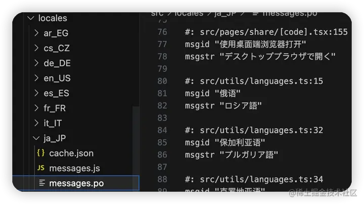 然后跑一下extract命令,就会生成每种语言对应的.po文件,注意,此时的.po文件是没有翻译的,比如/locales/ja_JP/message.po文件: