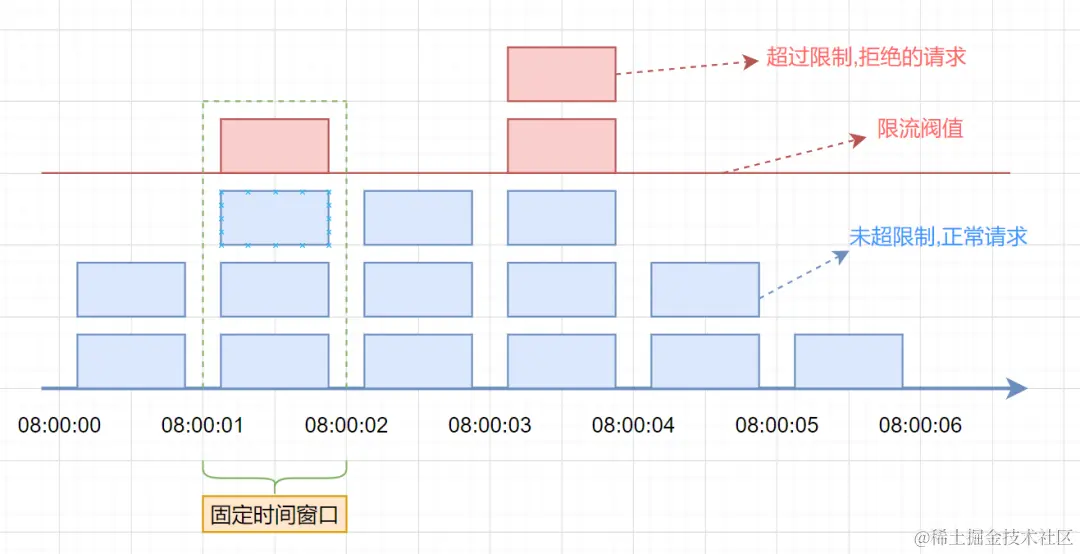 固定窗口限流算法(Fixed Window Rate Limiting Algorithm)是一种最简单的限流算法,其原理是在固定时间窗口(单位时间)内限制请求的数量。该算法将时间分成固定的窗口,并在每个窗口内限制请求的数量。具体来说,算法将请求按照时间顺序放入时间窗口中,并计算该时间窗口内的请求数量,如果请求数量超出了限制,则拒绝该请求。