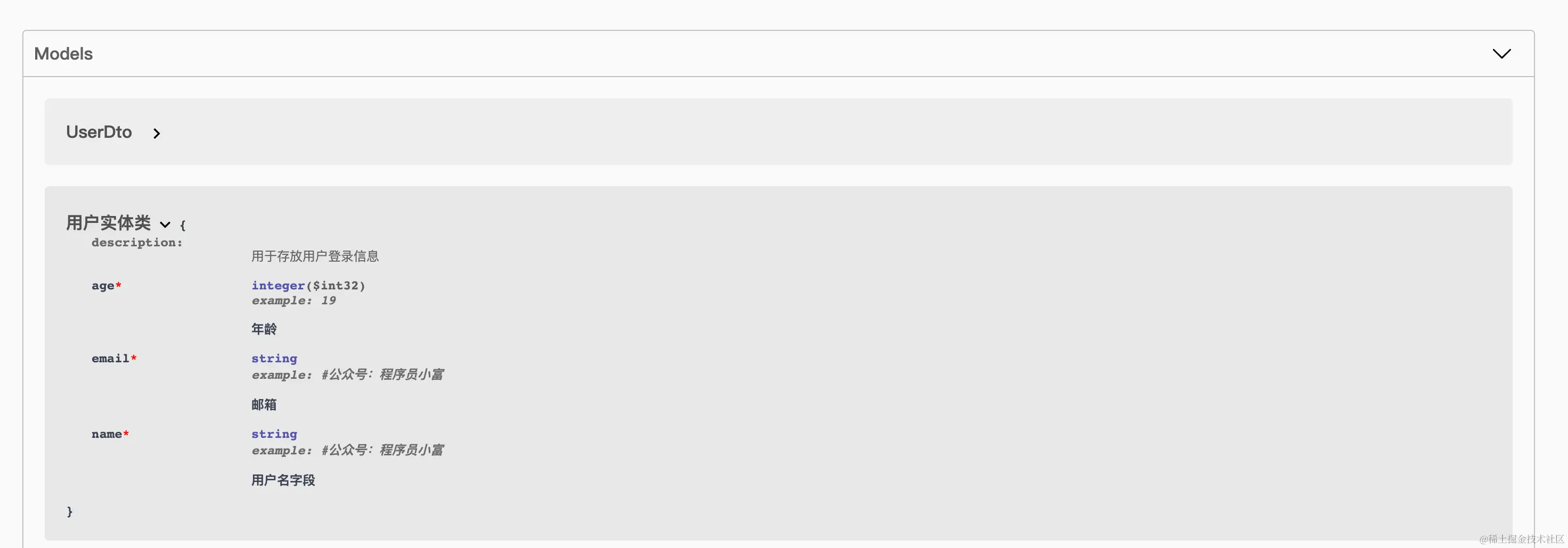 @ApiModelProperty(value = "邮箱", required = true, example = "#公众号:程序员小富")