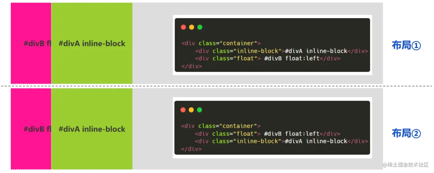注意这里 DOM 的顺序,是先生成 display:inline-block ,再生成 float:left 。当然也可以把两个的 DOM 顺序调转如下:
