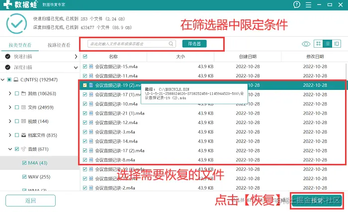 步骤4:软件执行深度扫描会花费较长时间,需耐心等待。完成扫描后,可能恢复的文件都会呈现出来,此时,用户可借助【筛选器】 对需要恢复的文件进行限定;