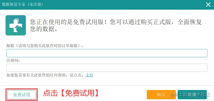 步骤1:连接u盘与电脑后,双击运行软件,看到 【免费试用】 提示后,点击即可进入软件主界面;