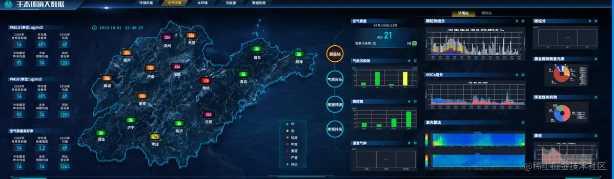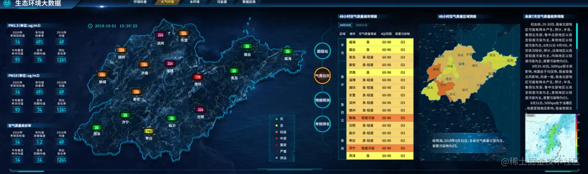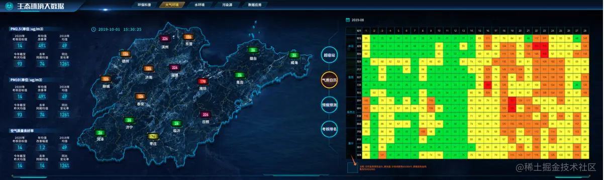 在大气环境板块分为省市两级,在省级界面主要是展现全省大气环境相关指数,如空气质量优良率 ,以及监测指标和全省的空气质量排名,数据有实时监控的也有年月日的数据分析展示。