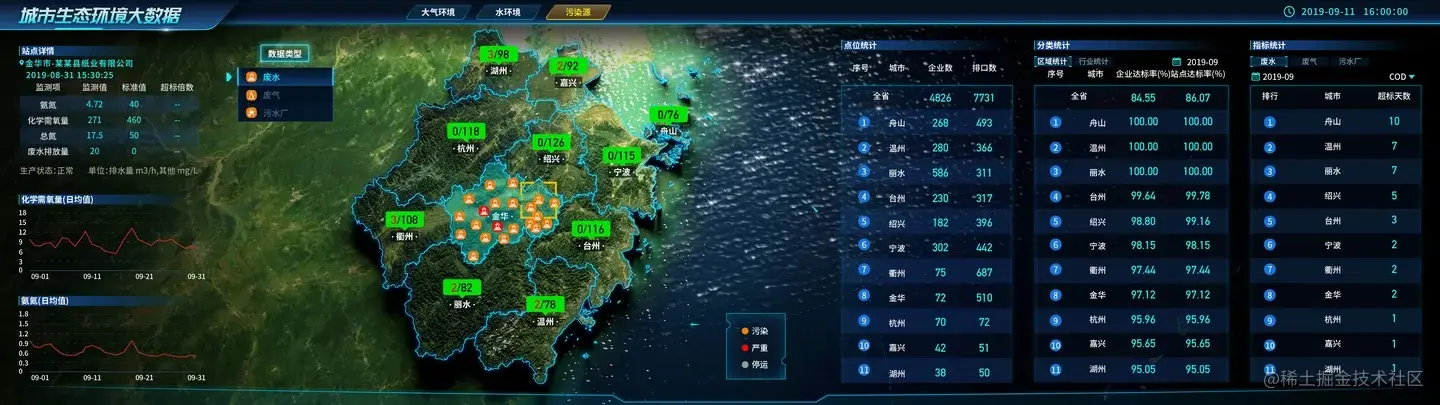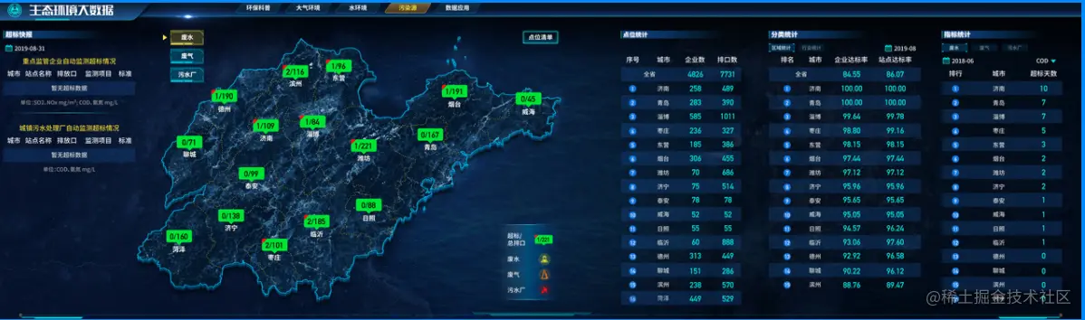 污染源的板块以不同地市间的废水、废气以及污水厂的相关指数展现为主。