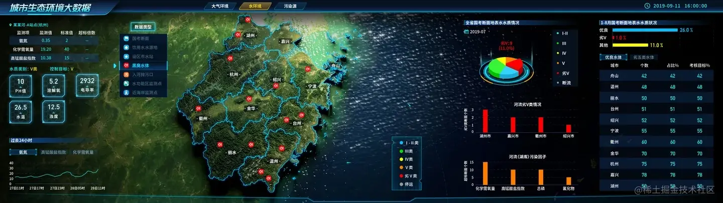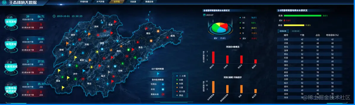 在水环境质量监测板块,主要展现了不同水源地的相关成分数值以及全省国考断面地表水水质情况和全省地市水质的集中展示。