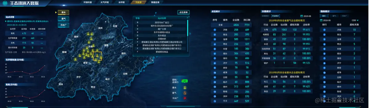 在污染源监测板块,主要是监测各个地市的站点数据,集中展现了哪些城市的污染指数过于超标,以及全是废气超标企业数量及分类情况。