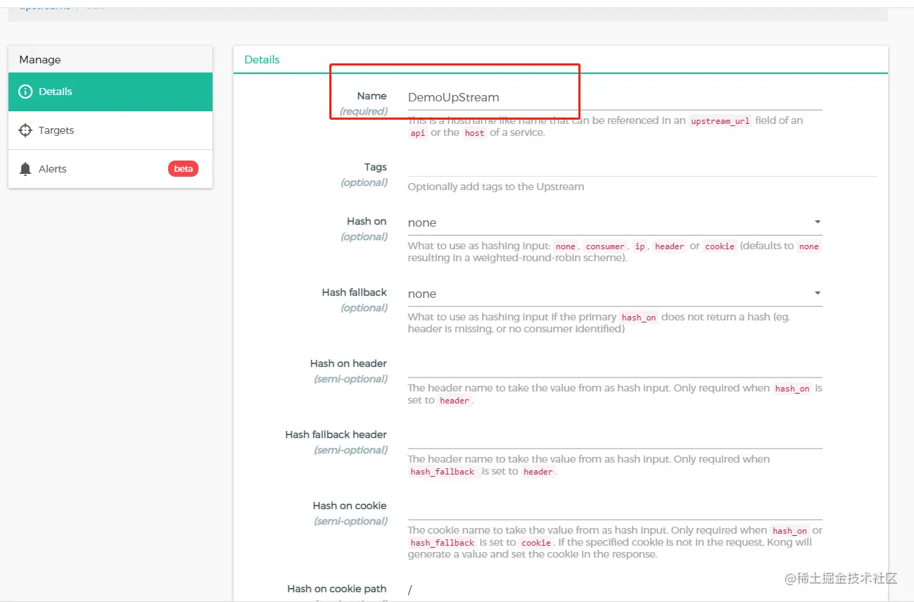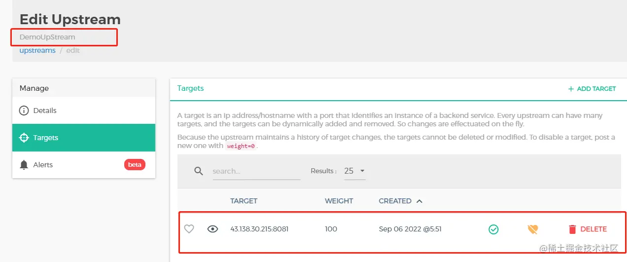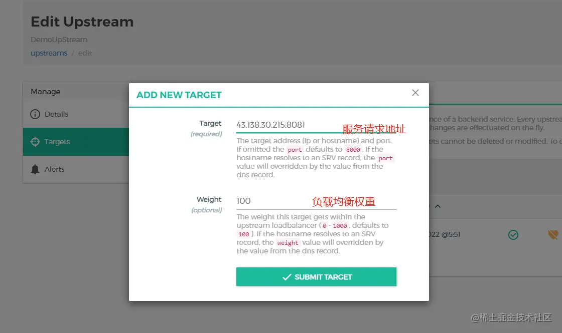 (2)trarget,目标,实际就是上游upstream的一个多个实际的某服务的请求地址(ip:port或者域名),在upstream详情里新增配置target。