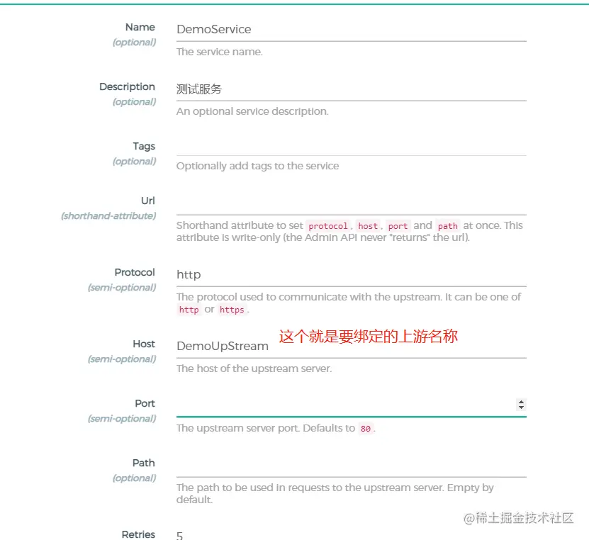 (3)service,服务,对实际服务(比如用户服务)的抽象概念,通过host绑定upstream,添加服务可配置的字段如下